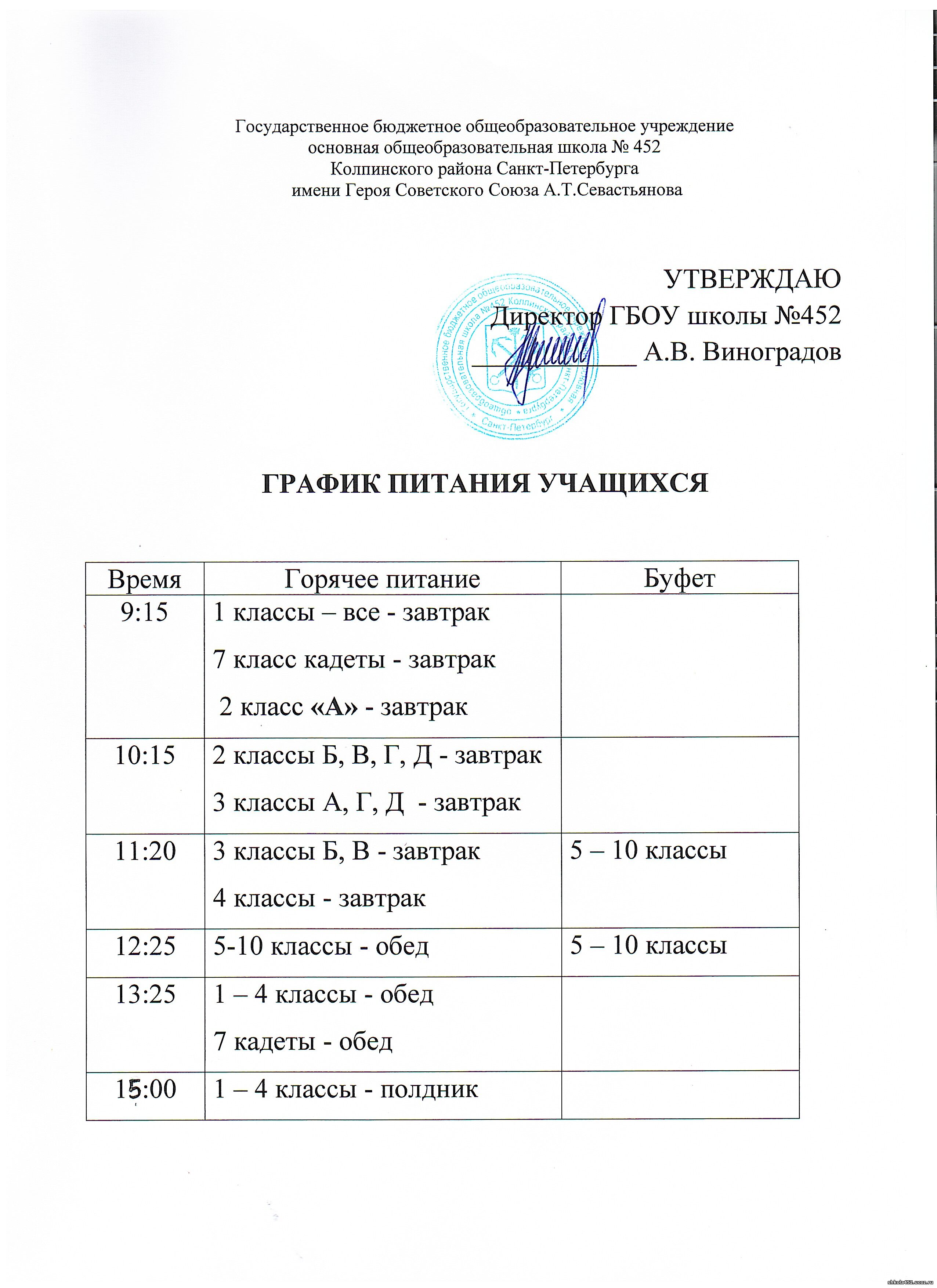 | Ответственный за организацию питания в школе | Мирина Алёна Анатольевна +7 (812) 417-26-99 sc452@obr.gov.spb.ru |